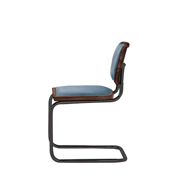 The early cantilevers of Stam, Lorenz and Mies and sling seats and backs of canvas which required that the two sides of the frame be joined at he upperback with a horizontal bar and that there be a steel support under the seat to keep the legs apart. Instead, both the cane and upholstered versions of this model have a rigid seat and back which allow the elimination of both the horizontal piece at the upper back and the steel support under the seat. The result is a chair of great simplicity and formal elegance.