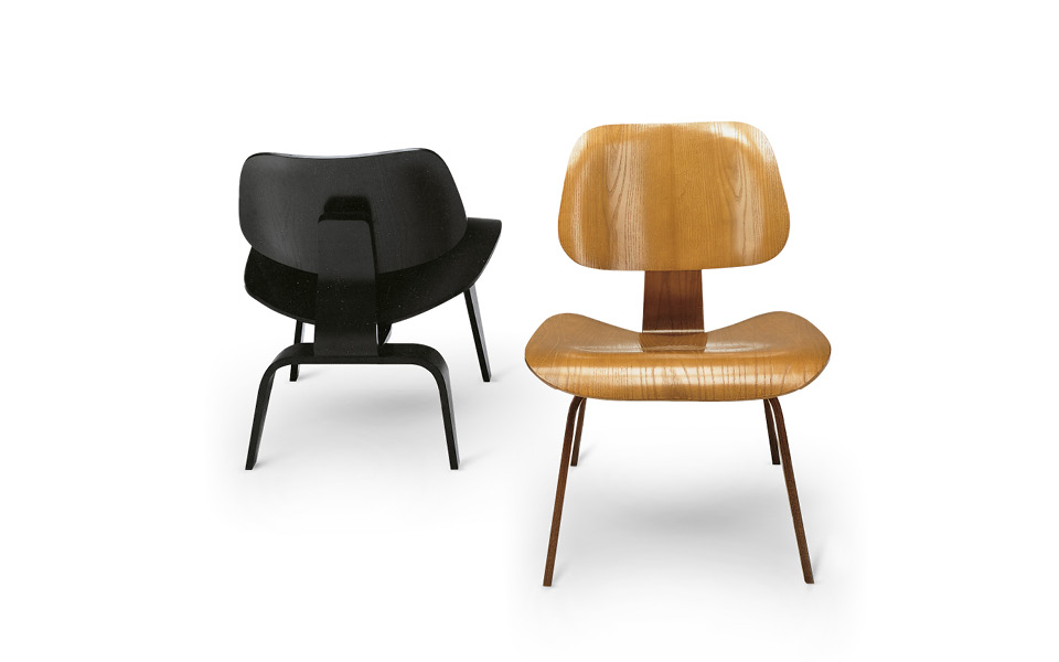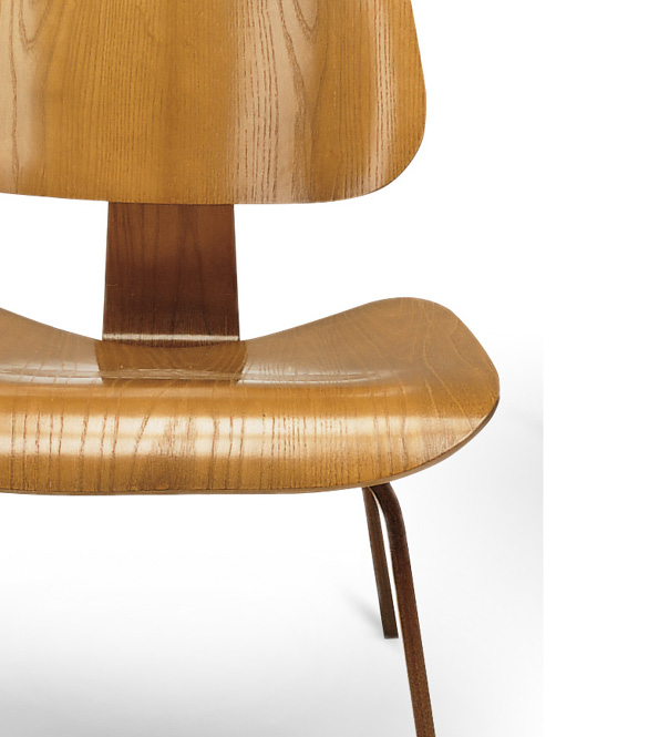 Esta silla es similar en su forma a todas las demás sillas de madera curvada (véase art, 744) expuestas en 1946 en la exposición que el Museo de Arte Moderno dedicó al mobiliario de los Eames. Es una versión más ancha y baja de la silla de comedor y tiene una historia idéntica. En 1950, esta silla con patas de madera contrachapada curvada, junto con la versión de silla de comedor, dejó de fabricarse. En la exposición de 1946 en el Museo de Arte Moderno también se presentó otra silla, que consistía en el mismo asiento y respaldo montados sobre una estructura tubular ligera. Esta silla, conocida popularmente como la "silla potato chip", se ha mantenido en producción hasta hoy. Por último, se observó que el contrachapado curvado tridimensional es más "orgánico" y avanzado que el curvado bidimensional de Aalto. Parece ser que Aalto hizo comentarios desfavorables sobre la flexión tridimensional pensando que la flexión no debía utilizarse de esa manera. Es más probable que la razón de esta afirmación sea que el curvado tridimensional crea una serie de problemas técnicos que alargan los tiempos de producción y aumentan los costes. En el plegado bidimensional, se pueden hacer varias piezas a partir de una sola lámina tras el plegado. En cambio, en el plegado tridimensional normalmente sólo se puede prensar una pieza a la vez. Por ello, estas sillas de madera contrachapada son bastante caras de fabricar y, por esta razón, fueron sustituidas en 1950 por la "silla potato chip", más barata. Sin embargo, las curvas tridimensionales de los muebles Eames dan una sutil sensación orgánica y consiguen un confort que no puede proporcionar la curvatura bidimensional.