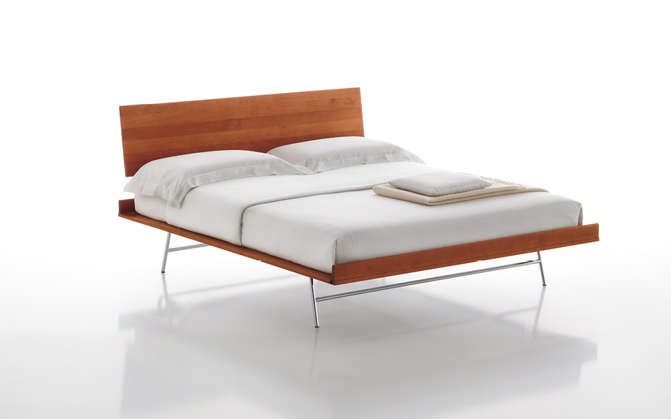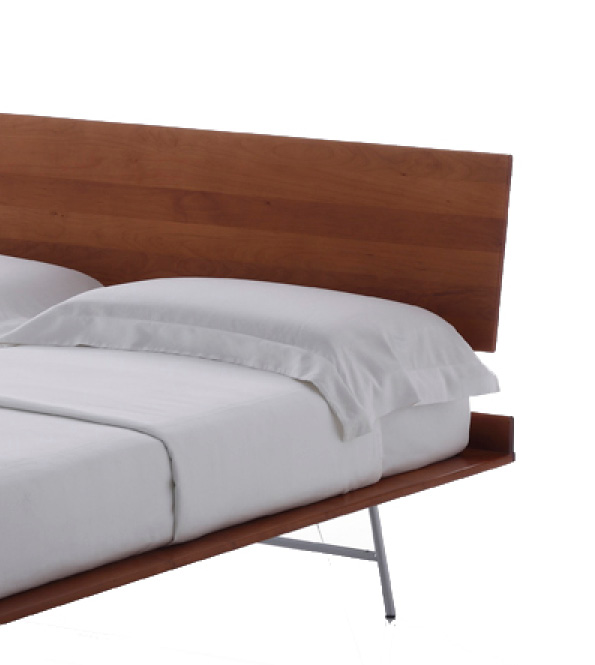 Lit avec structure en merisier. Sommier avec lattes en hêtre. Piètement en tube d’acier