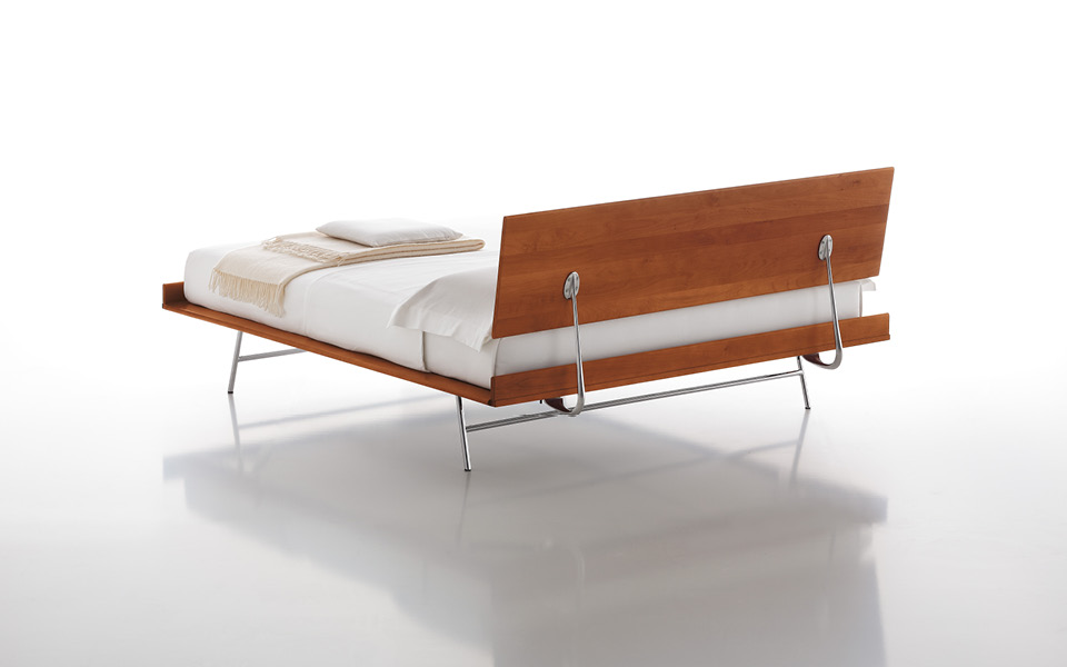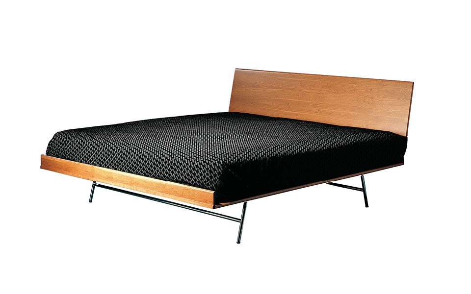 Le lit 777 de George Nelson, l’un des pionniers de la modernité avec d'autres designers américains extraordinaires. Réalisé avec une simple structure en cerisier, il est essentiel et sophistiqué grâce au profil extrêmement léger et dynamique. Le plan horizontal sur mesure est linéaire et mince, uniquement fini avec deux bandes en bois aux extrémités. Le dossier est un panneau très propre en bois raccordé au plan lit grâce à deux éléments courbes en acier tubulaire chromé. Le même matériau est également employé dans la base mince de soutien, qui se compose de deux trépieds inclinés.