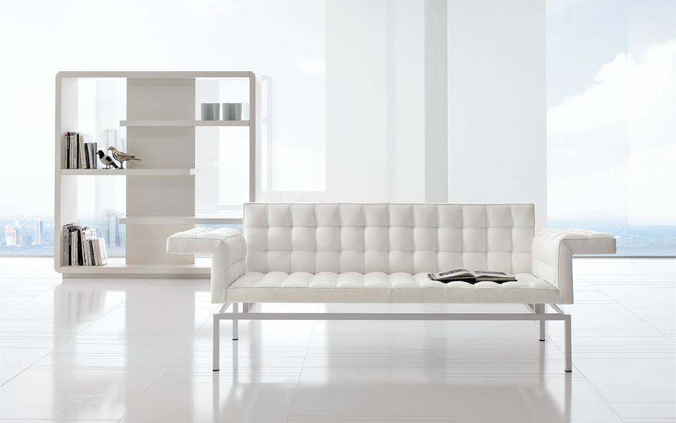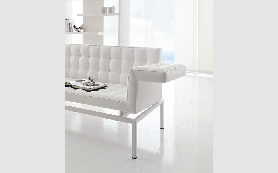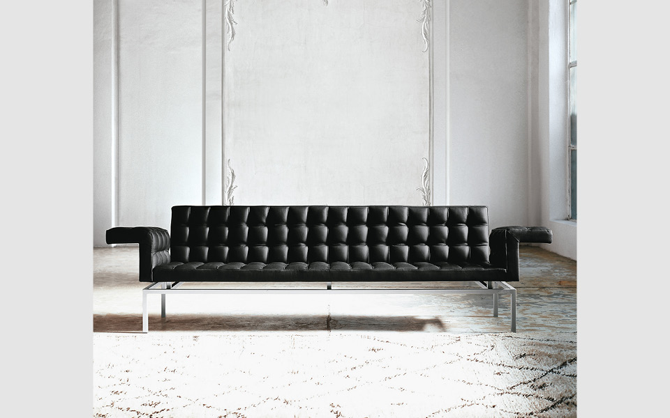 Le Divan Boss s’inspire du style géométrique iconique du Kubus de Josef Hoffmann. Parmi les particularités, il y a le concept du volume géométrique et précis ; assise et accoudoirs gardent les mêmes épaisseurs, les rembourrages adoucissent et définissent la forme. Caractérisé par un travail capitonné riche et ample sur toute la surface, réalisé avec des travaux artisanaux maîtrisés. La structure interne en acier recouverte en mousse de polyuréthane flexible à froid et la basse en tube en acier chromé ou peint créent un magnifique contraste avec le revêtement en cuir ou en tissu, pour apporter une touche de raffinement et d’élégance.