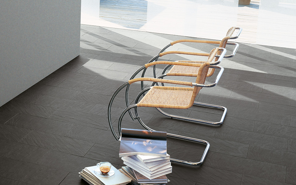 Cette chaise en « porte-à-faux » avec assise et dossier en cuir fut exposée pour la première fois à l’Exposition de Weissenhof de 1927. De 1927 à 1930, elle fut produite par Berliner Metallgewerbe Joseph Muller. En 1931, le directeur technique de cette usine ouvrit une autre entreprise, Bamberg Metallwerkstatten, à Berlin, et il y transféra la production complète des meubles de Mies van der Rohe et de Lilly Reich. L'exposition et le catalogue de cette nouvelle entreprise furent sans doute dessinés par deux architectes. La collaboration fut toutefois de courte durée car en novembre de la même année, Mies signa un contrat avec Thonet Mundus de Zurich, qui permit aux modèles une distribution mondiale. Mies van der Rohe admit la priorité de Mart Stam dans la conception d’une chaise « en porte-à-faux », mais il revendiqua avoir été le premier à concevoir un modèle qui tirait parti de la souplesse du tube en acier tréfilé à froid. Il demanda un brevet le 24 août 1927.